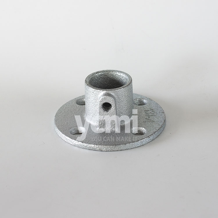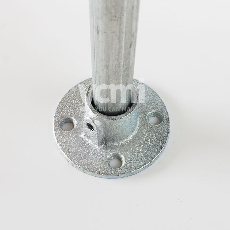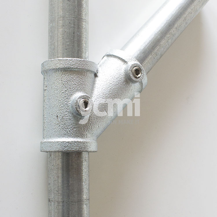 The upright passes through the fitting. This is to give a 90° corner joint for the middle rail of safety railing and other rectangular structures.