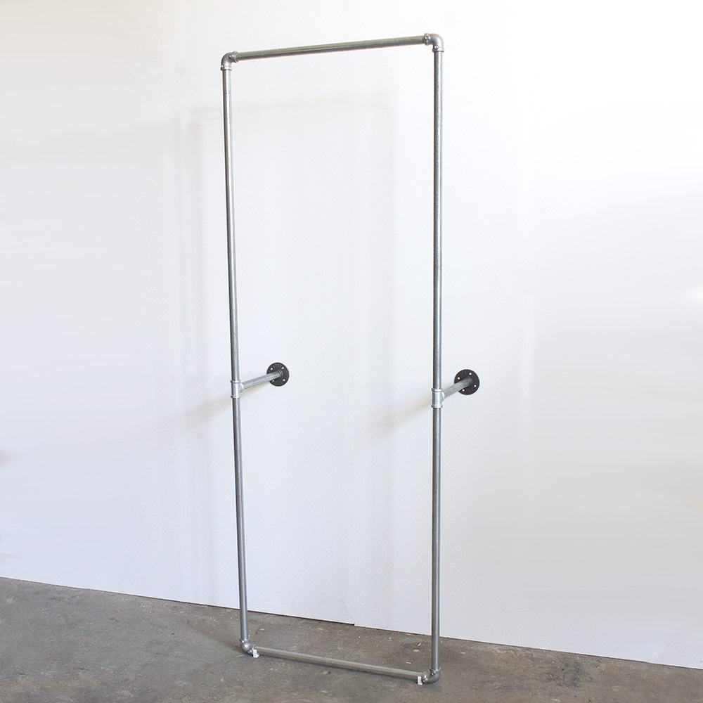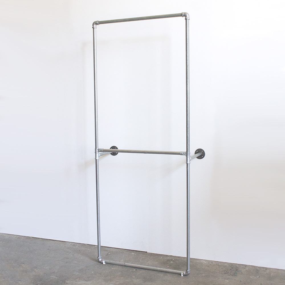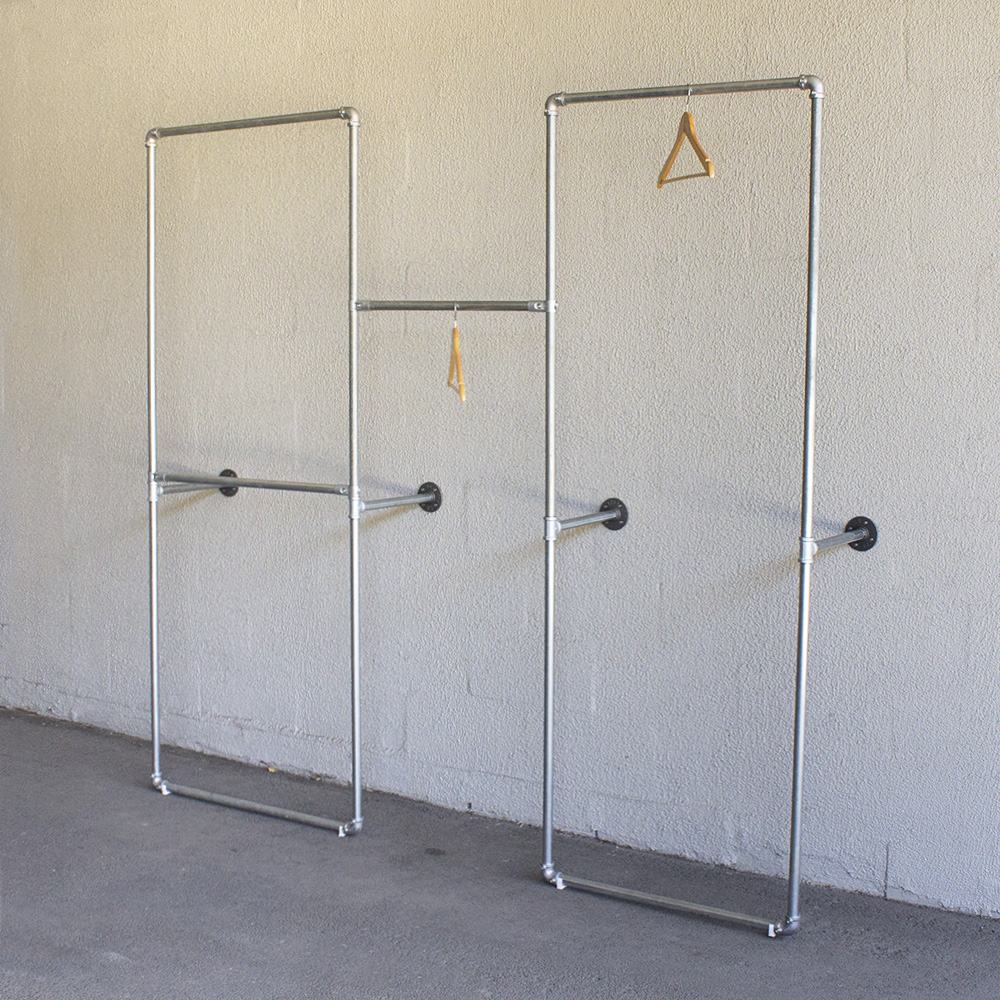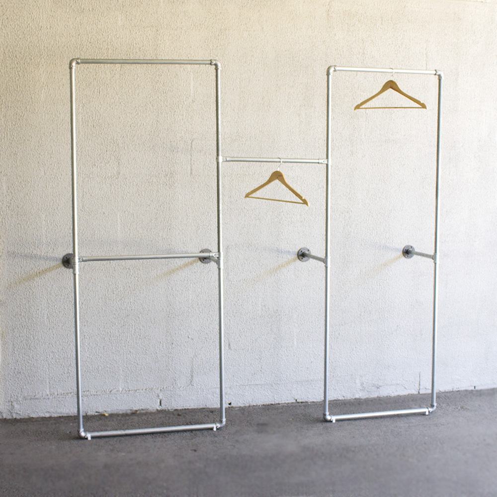 This Industrial chic style garment rack system is perfect for fashion boutique stores. The combination of galvanized pipes and alloy tube klamp fittings make it easy to install and flexible. We can change parts to fit your space and clothing requirement.